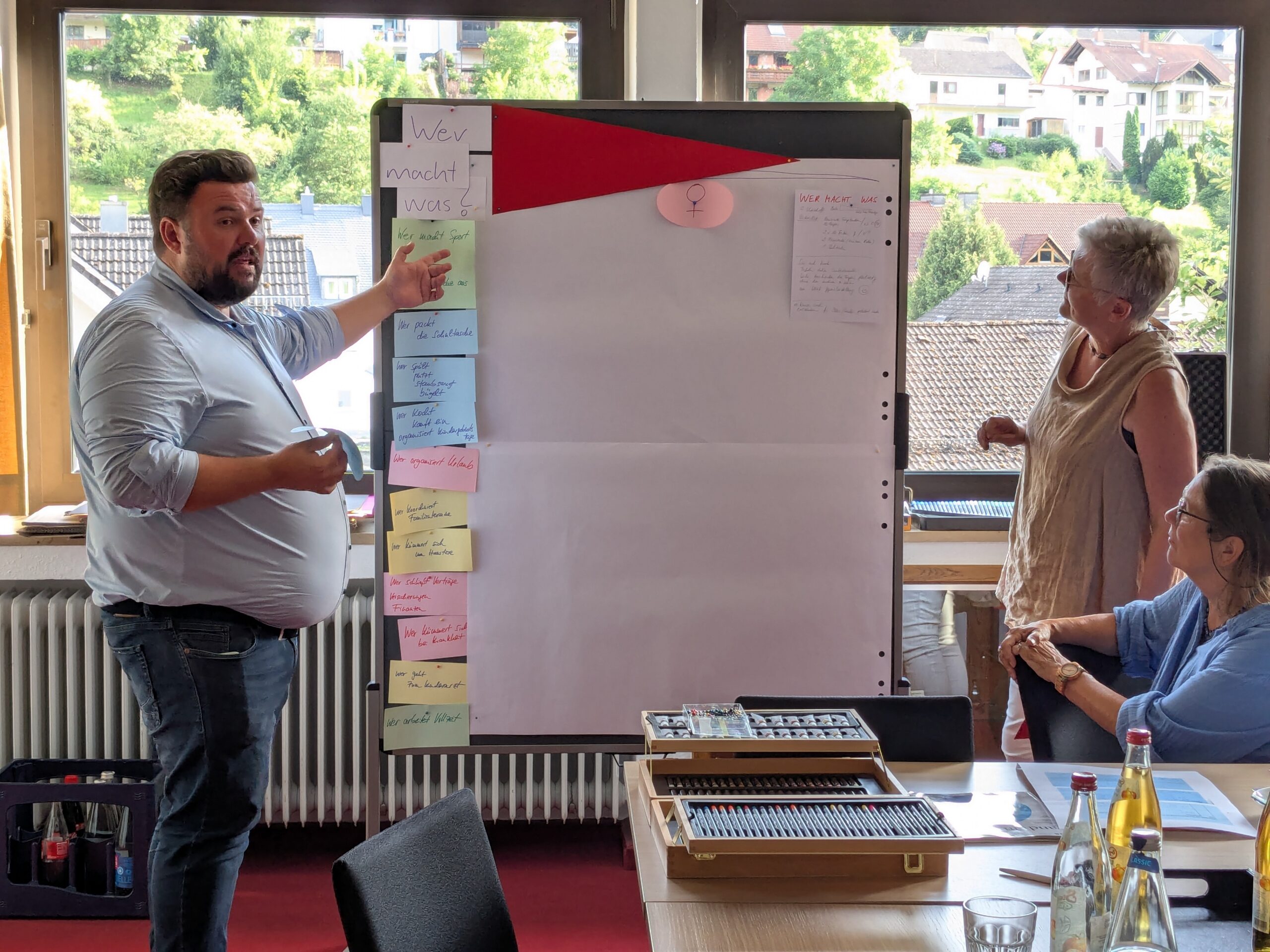 - Fragebogen für Eltern auf einer XXL-Tafel mit vergleichender Selbsteinschätzung rund um Arbeit, Haushalt, Kinder …
